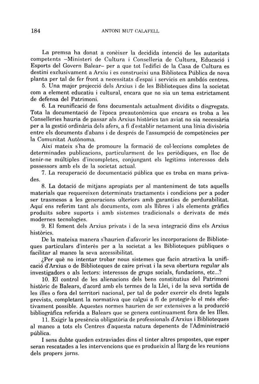 MUT CALAFELL, Antoni, 1992. Parlament del Sr. Antoni Mut Calafell director de l’Arxiu del Regne de Mallorca amb motiu de la inauguració del Congrés. Reflexions sobre la defensa del fons bibliogràfic, documental i gràfic del patrimoni cultural de les Illes Balears. Boletín de la Sociedad Arqueológica Luliana, BSAL, 48, 169-186. ISSN 0212-7458.